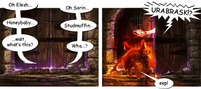 Anyway, the party was going great. We’d just conquered Mirrodin and all of us were there. Except Urabrask, who was hiding as usual.