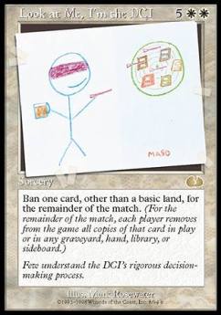 But you’re kind of missing the point. And that is that when Yawgmoth unleashes a plague or Nicol Bolas screws some mindwrenched pawn, the victim is a fictional character. You’re not involved at all. You’re just reading a book or some flavour text and going ‘LoL’. But when Mark Rosewater does something, the victim is you.