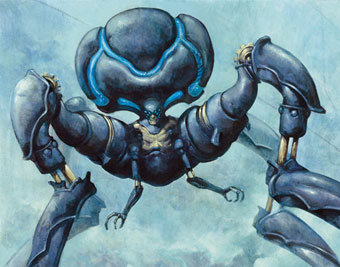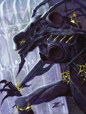 Right at that time all the other nations of Dominaria rocked up on the Thran’s doorstep demanding Yawgmoth’s head. In the global war that followed, Yawgmoth would drag Thran civilians back to Phyrexia and re-engineer them into mechanical killing machines and send them back to slaughter his enemies. Along with clouds of noxious plagues. Yawgmoth’s dominance was close to assured until his former lover, tired of the whole bad-boy thing, destroyed the Phyrexian portal, and locked Yawgmoth out of Dominaria forever.