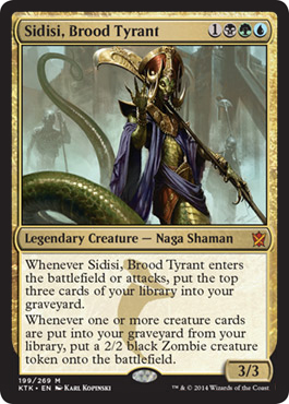 Khans of Tarkir is as far as I’m concerned probably the best expansion ever made, and a large part of that is due to the fact it’s absolutely dripping with flavor. For me the Chef’s Special that takes up a full page of the menu is the Sultai Brood and their scheming bitch leader Sidisi.