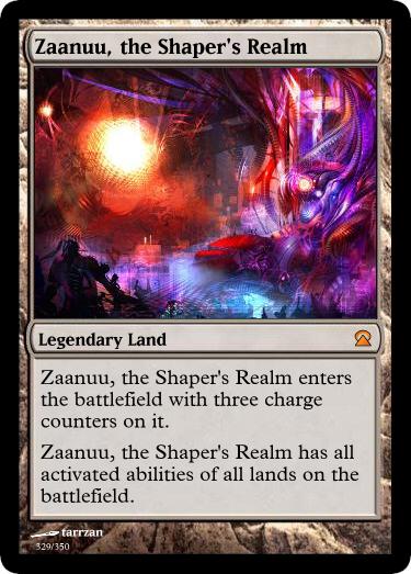 Mulaya, Heart of Vallinost– When the ‘mythic’ rarity got introduced I decided I wanted a full cycle of mythic rare lands. They had to be super splashy, and the idea originally came to me as storage lands that never lost their storage counters. I dare say these would be extremely popular if they were ever printed, and the new legendary rule as of June 2013 only upgrades the power of these lands.