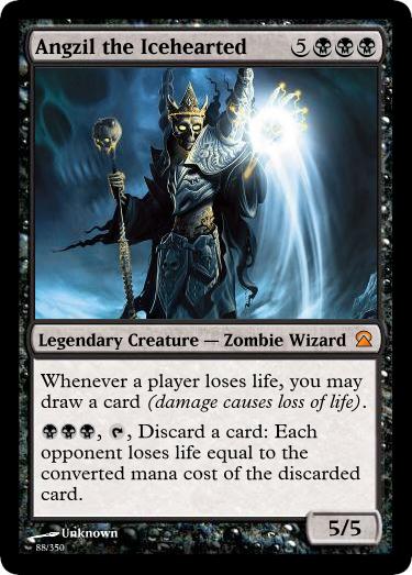 Angzil the Icehearted– For a while I rather fancied making a whole Terranova block, and one thing that was never elaborated anywhere was that in the second set a powerful lich would emerge from the Undercity and serve as the main villain, at least until the Silhouette shows up. After shuffling the mythics around, and figuring I might never complete the block, I realized I could put him in this set.