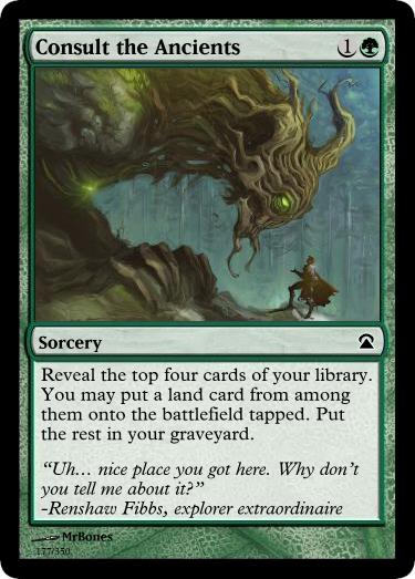 Enchantressβs Awakening– This was the very last card designed for the set. There was a hole for a green rare and I had been mulling over the fact there actually were a lot of enchantments in the set but nothing that really fed off them. Combining enchantments with a land theme gave me this, and Iβve got to say itβs one of my personal favorites. Itβs exactly the kind of awesome Johnny power that would make me drool in real life.
