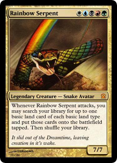Rainbow Serpent– One of the central themes of many Aboriginal myths is that of a creator spirit called the Rainbow Serpent who crafted the world from his coils. The idea for this card originated from the very start and didn’t change a bit.