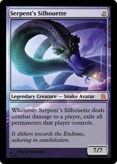 Serpent’s Silhouette– Originally the set’s poster bad-boy was the black mythic, a fact I was not entirely at ease with. But as this set’s redesign started with ‘man I really gotta Zaanuu‘, that opened up a spare slot. He is now colourless as he should be and provides a nice contrast between the creator Rainbow Serpent.