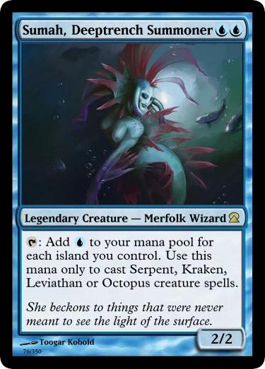 Sumah, Deeptrench Summoner– This girl only came in in the revision, and I admit I really, really like her. I also admit I really liked Anna Fibbs, the previous blue legend too, but she just wasn’t cool enough. This card came from musing how awesome it would be to have Deeptrench Summoner as an EDH commander, as well as realizing that card made no sense at common.