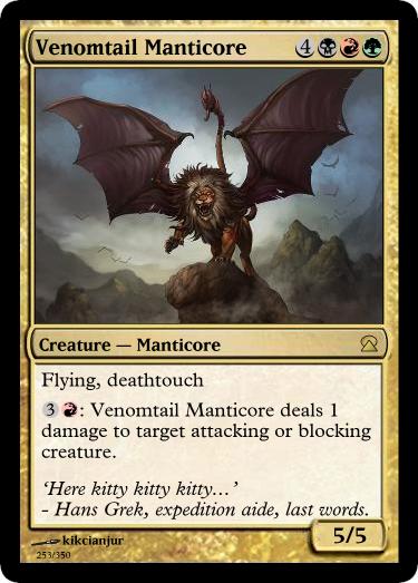 Venomtail Manticore– Despite loving dragons, when I was adding more fatti- *cough* revising the set I wanted to have a large red-based flyer somewhere that wasn’t a dragon. First pick in Rochester Draft, guaranteed.